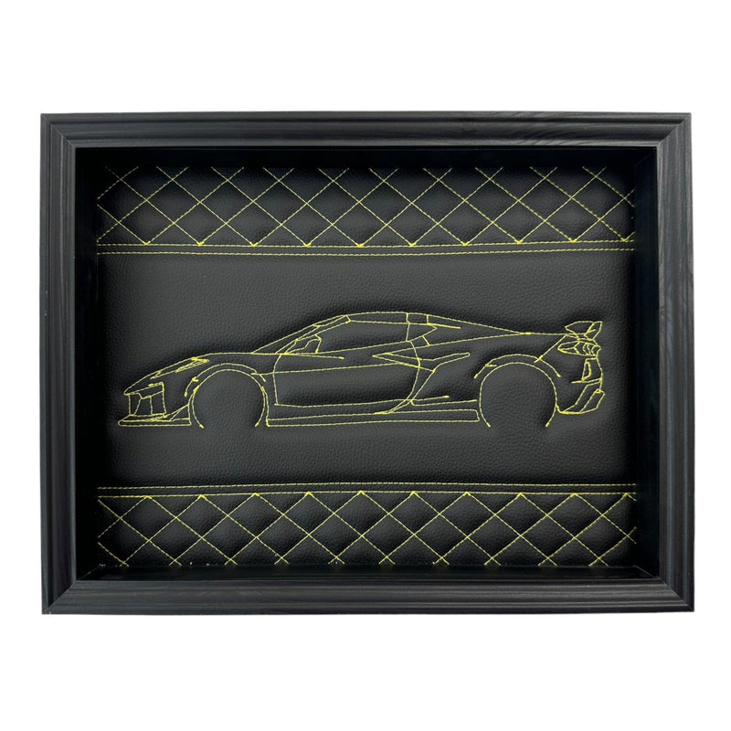 Schwarzes Leder-Mini-F56-inspirierte Wandkunst: Gestickter gelber Stich