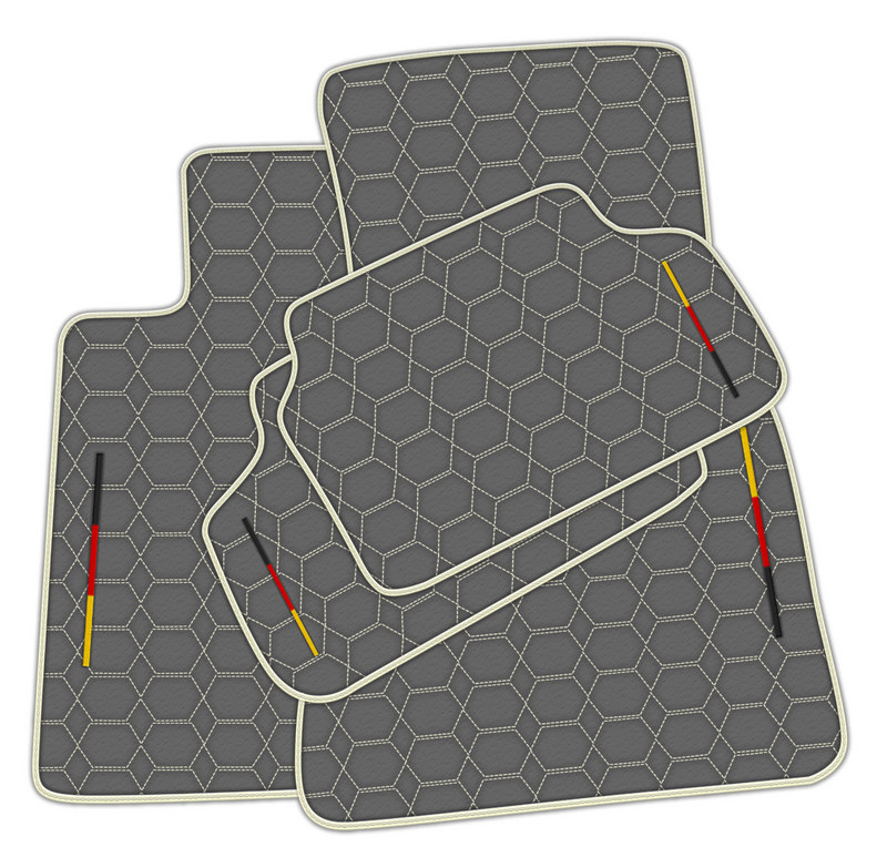 Werten Sie Ihren BMW mit unseren grauen Lederfußmatten auf. Mit ihrem Sechseckmuster, weißen Nähten und weißem Rand verleihen diese Matten Ihrem Fahrzeuginnenraum einen Hauch von Luxus. Hergestellt aus hochwertigen Materialien, sind unsere Matten robust und stilvoll und verleihen Ihrem Auto einen von der deutschen Flagge inspirierten Look.